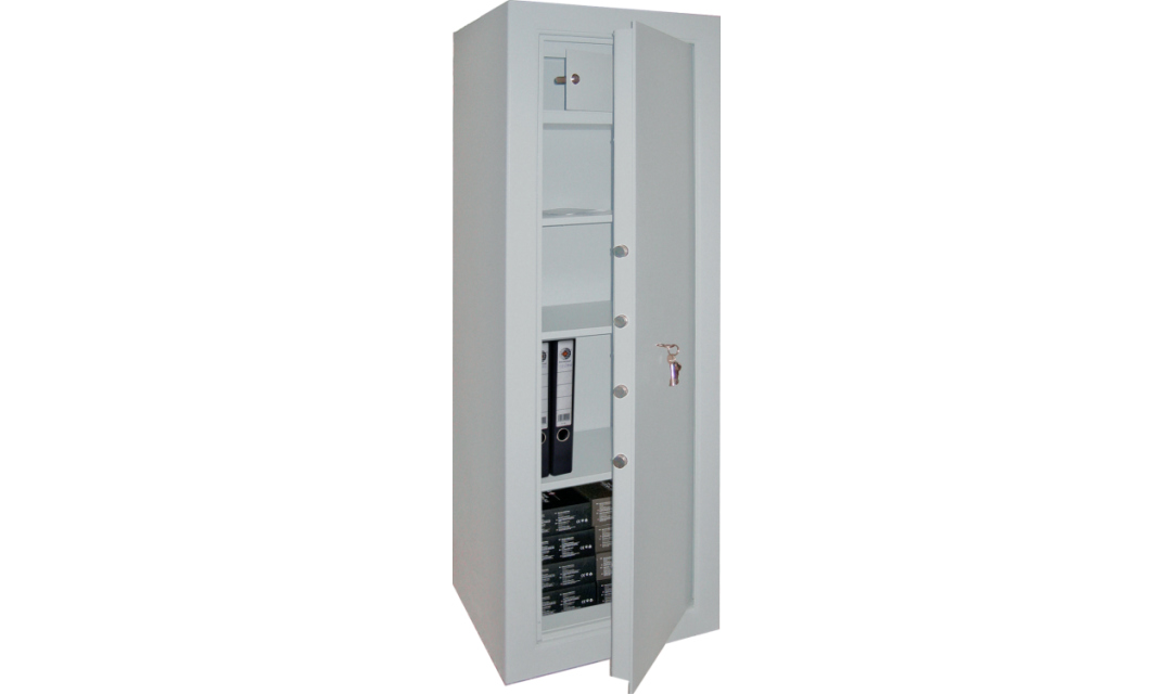 Корпус сейфа и дверь заливные. 3-х сторонняя ригельная система запирания; с увеличенным ходом горизонтальных ригелей. Защита замка от высверливания.