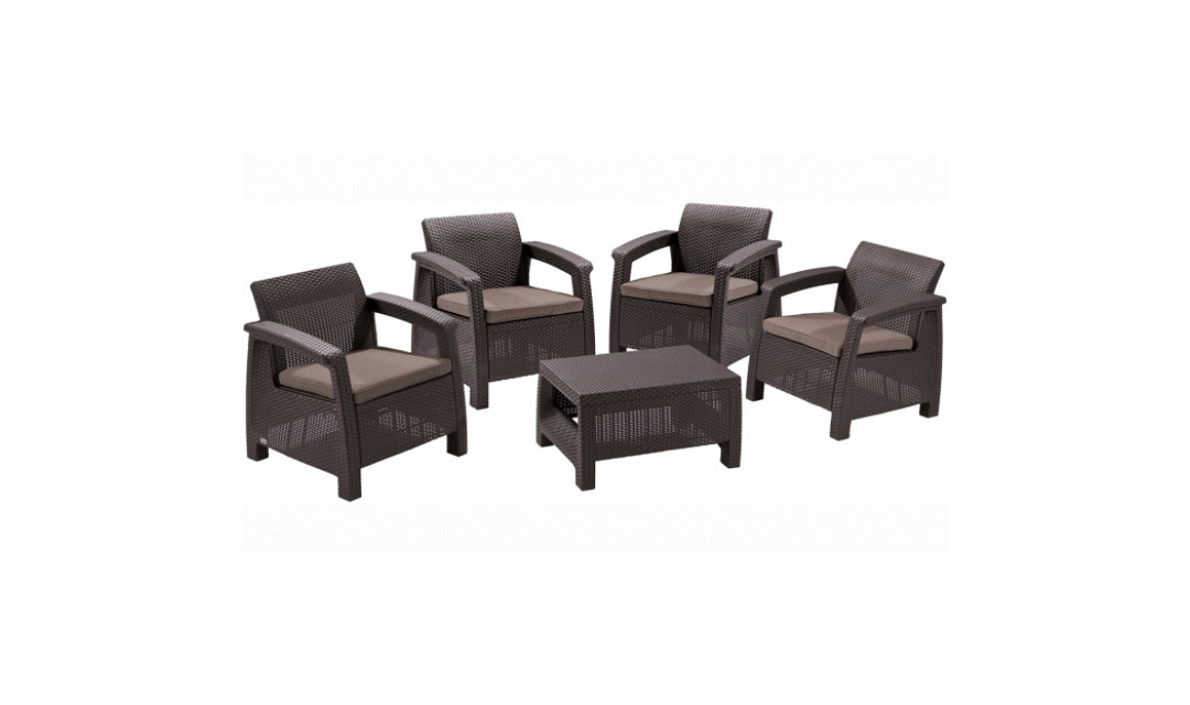 Комплект садовой мебели Corfu quattro set состоит из 4-х кресел и столика. Темно-коричневого цвета с серыми подушками.