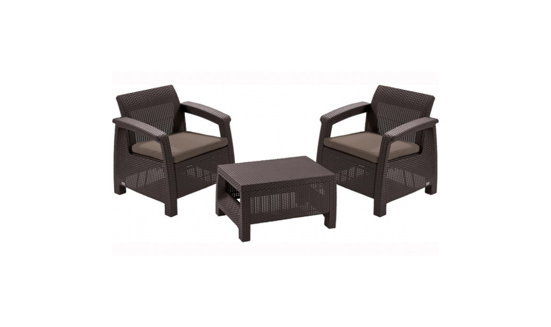 Комплект садовой мебели Corfu Weekend set состоит из 2-х кресел и столика. Темно-коричневого цвета с серыми подушками.