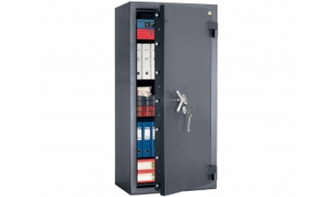 Корпус сейфа и дверь заливные. 3-х сторонняя ригельная система запирания; с увеличенным ходом горизонтальных ригелей. Защита замка от высверливания.