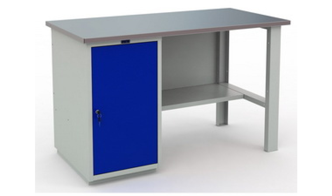 Верстак окрашен порошковой краской, цвет покрытия корпуса серый шагрень (RAL 7038), лицевая панель дверцы тумбы – синий шагрень (RAL 5002)