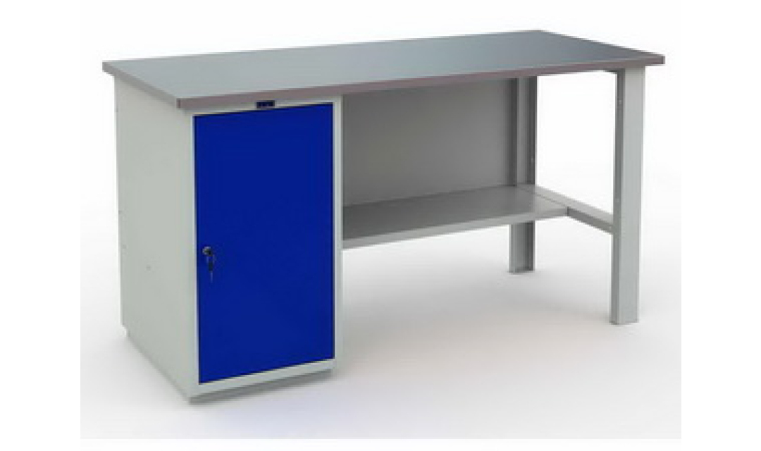 Верстак окрашен порошковой краской, цвет покрытия корпуса серый шагрень (RAL 7038), лицевая панель дверцы тумбы – синий шагрень (RAL 5002)